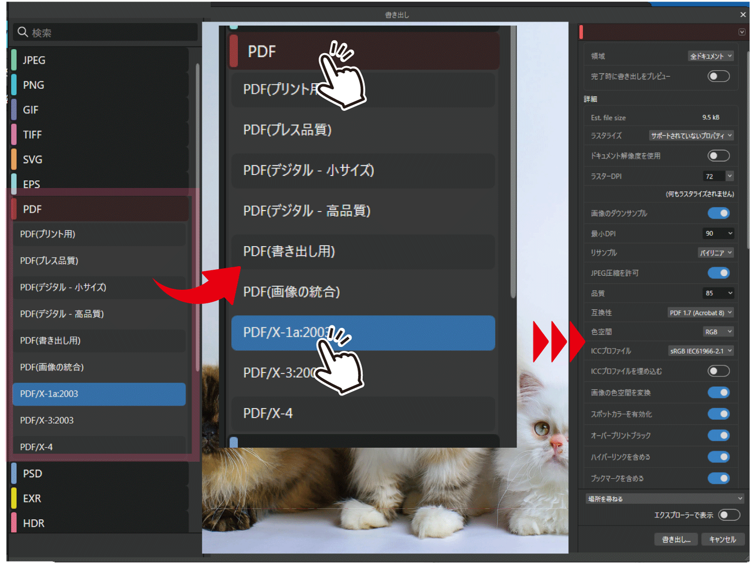 【2】互換性を「PDF/X-1a 2003」にする。