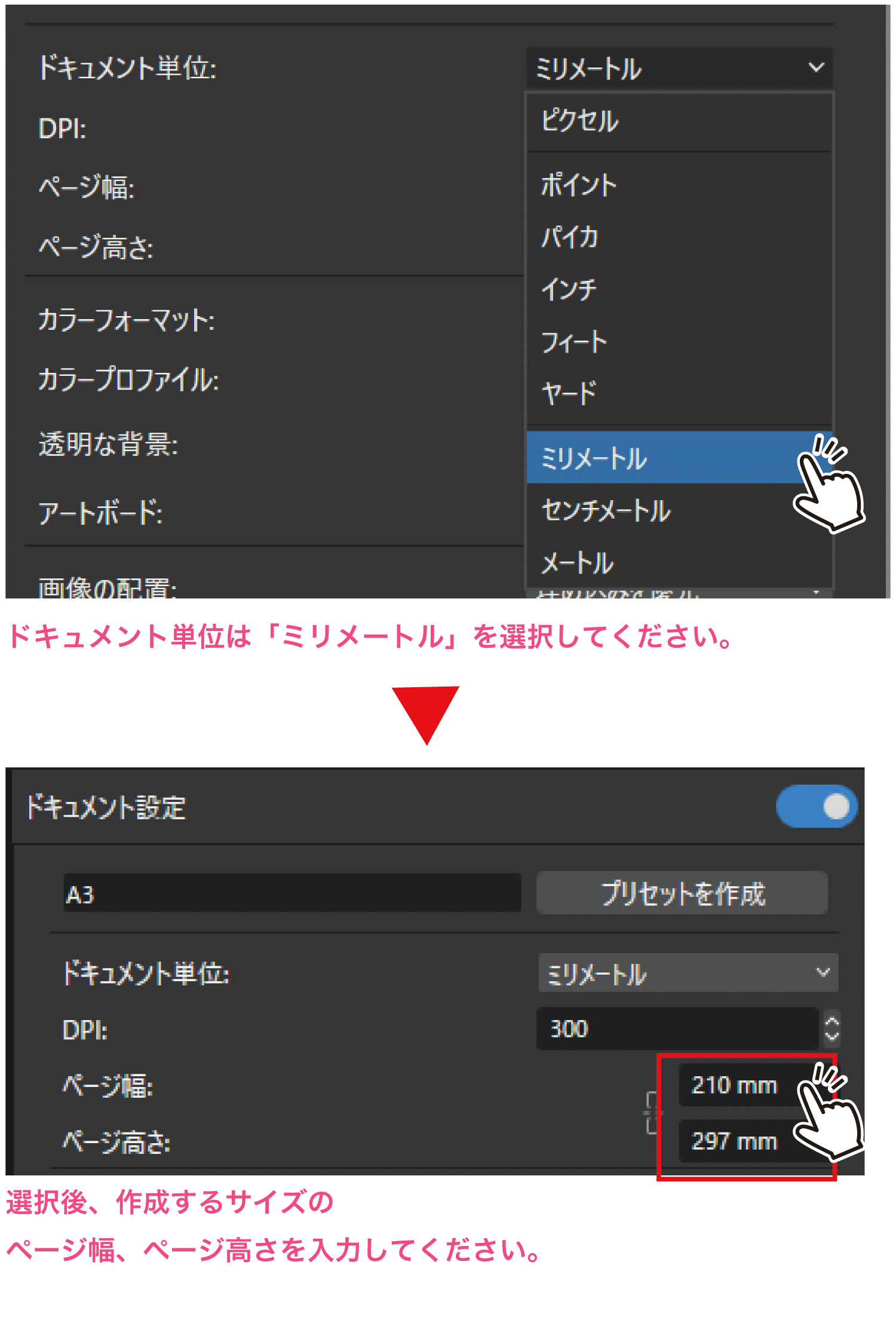 ドキュメント単位で「ミリメートル」を選択した後、