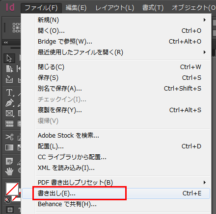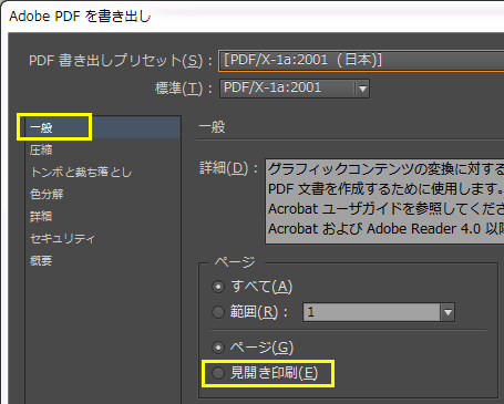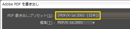 ダイアログが開くので、「PDF書き出しプリセット」を[PDF/X-1a(日本)]にする