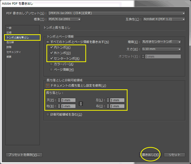・「トンボと裁ち落とし」でトンボにチェックを入れ、裁ち落とし(=塗り足し)を設定する