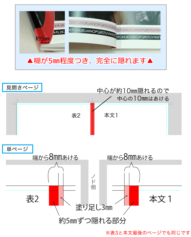 表2・表3と、それに隣り合う本文ページのノド側については、糊が付くため5mm程が完全に隠れます。
