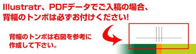 トンボ(トリムマーク)とは、作成したデータに対して、印刷範囲や断裁の位置、折り位置などが明確に分かるようにする為の目印で、背トンボは、中心および背幅の位置を示すマークのことです。 弊社では原則としてご入稿データをそのまま面付け・印刷しますので、ドキュメントのサイズが不適当な場合や、ドキュメントに対して中心がズレている場合などに、トンボがないとお客様の意図と異なる仕上がりになってしまう恐れがあります。 |