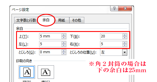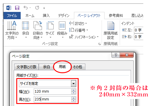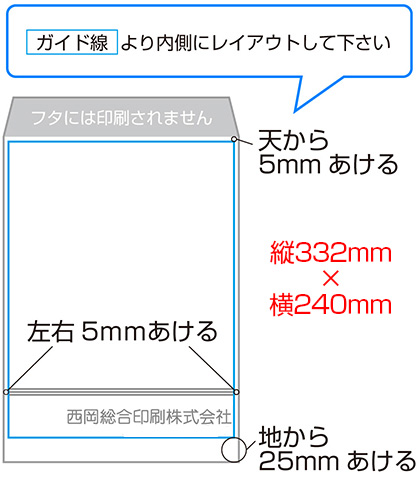 角2封筒のデータは、240㎜×332㎜(フタ部分は含まない)で作成し、天・左右から5㎜、地から25㎜あけて文字等をレイアウトしてください。