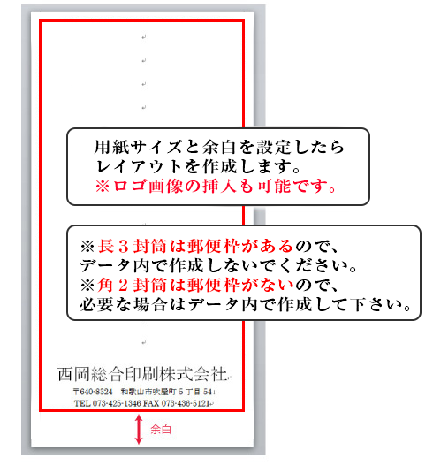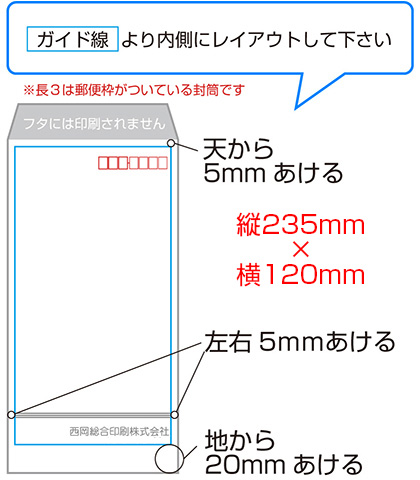 長3封筒のデータは、120㎜×235㎜(フタ部分は含まない)で作成し、天・左右から5㎜、地から20㎜あけて文字等をレイアウトしてください。