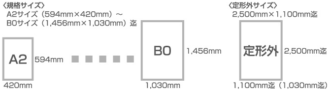 ・定形外サイズで 「厚口コート紙」か「合成紙」の場合は、最大2,500mm×1,030mmまでの対応になります。