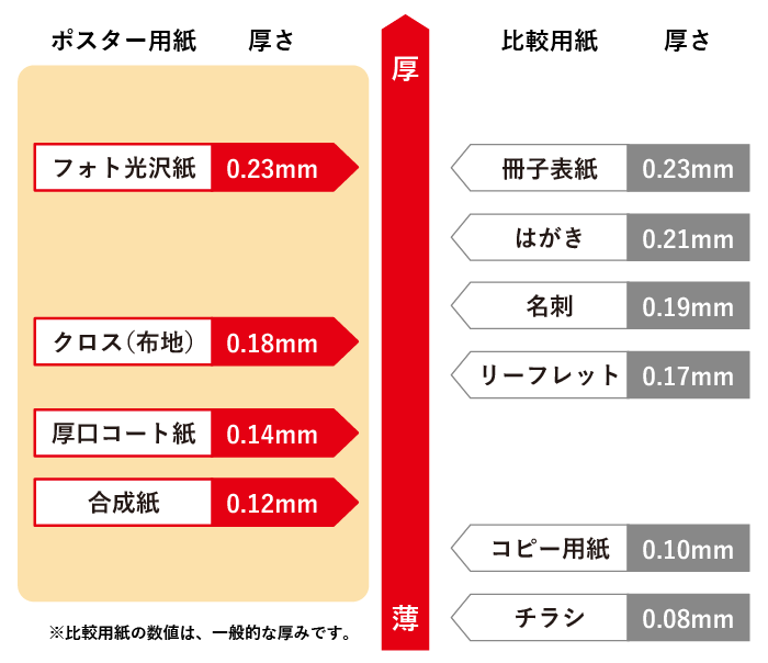 ポスター用紙の厚さについて、イメージしやすいよう比較表をご用意しました。