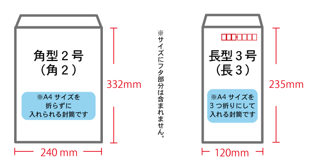 ※角2は〒枠なし(データによる印刷は可能)の封筒、長3は〒枠ありの封筒になります。
